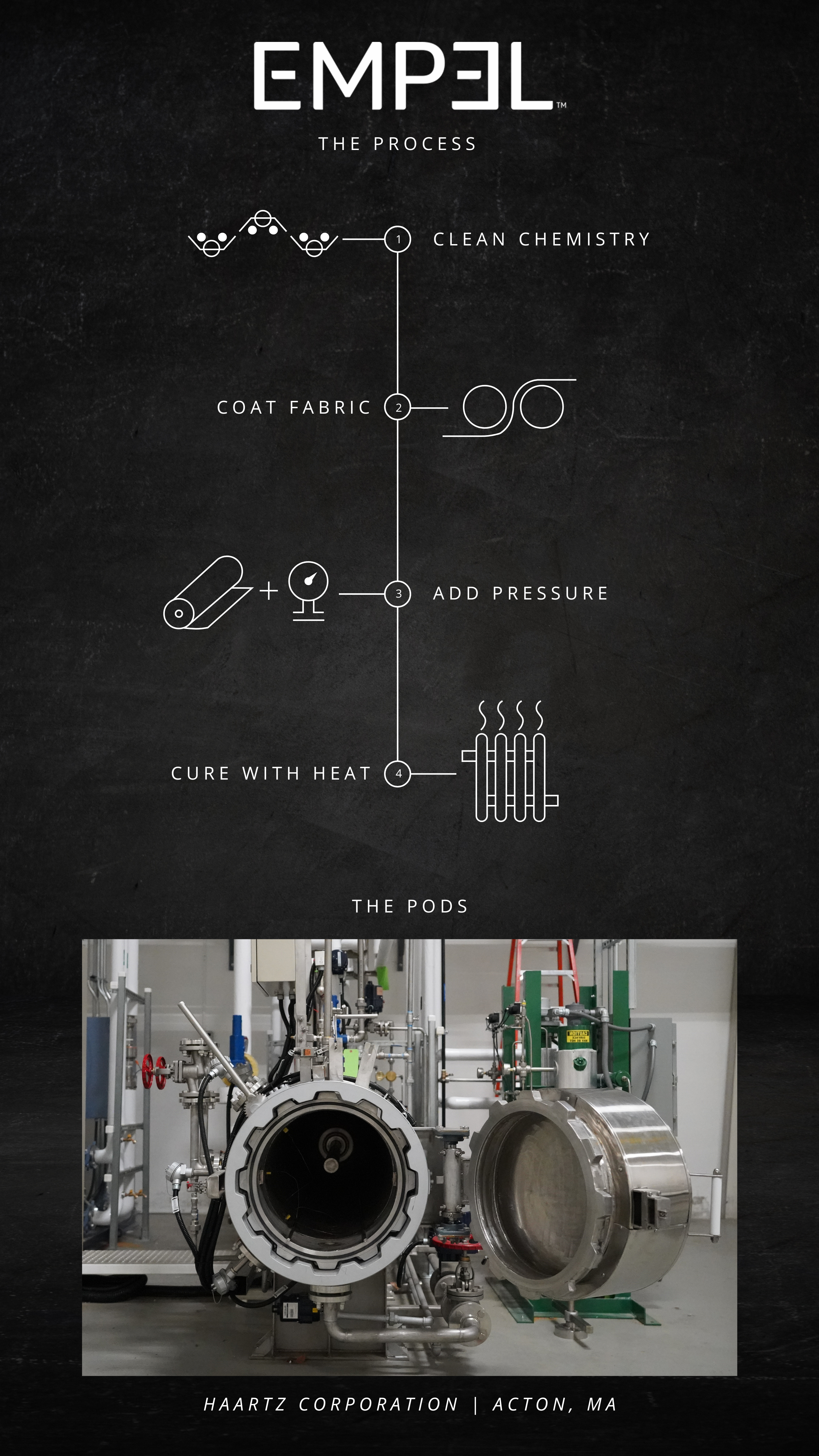 EMPEL completely transforms the environmental impact of textile finishing while offering unparalleled performance. Fabric production is the second largest water polluter in the world, quietly polluting trillions of liters of water every year. Traditional wet fabric production methods require significant energy to dry the fabric and generate waste streams that must be treated downstream. EMPEL is safe, PFC free and independently certified by Oeko-Tex® to meet or exceed global safety standards. The EMPEL water-free process eliminates water pollution caused from fabric finishing.