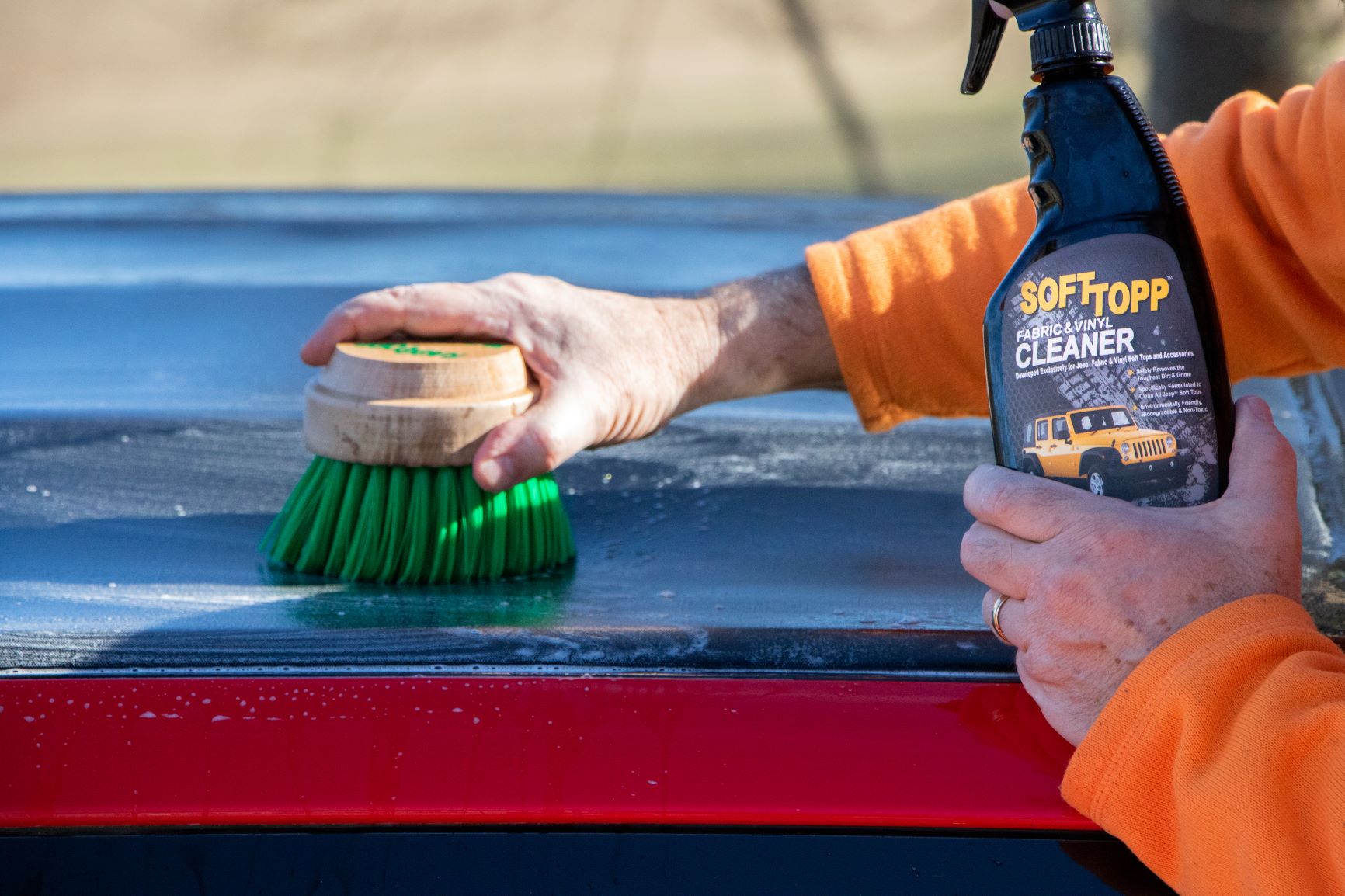 2. Use a vacuum brush to lift dirt, pollen, and other debris from the material. A vacuum brush is the easiest way to remove debris from your soft top. Generally speaking, the softer the brush, the better. However, we do have specific tips depending on your kind of top.